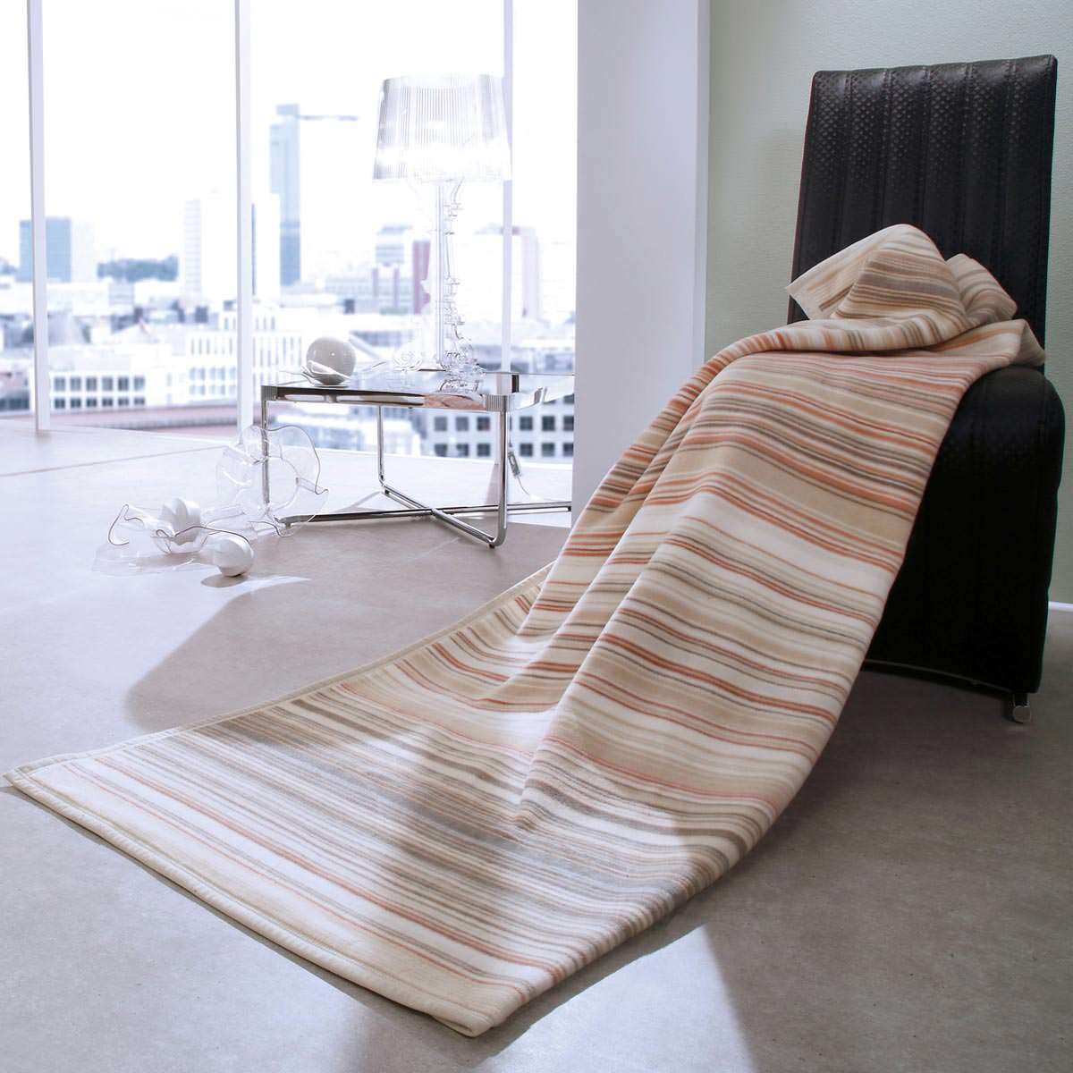 Die Wohndecke visiona cotton "Bonsoir" des bekannten Markenherstellers Biederlack hat ein helles und freundliches Streifendesign. Die helle Decke mit auffälligen Akzenten passt zu jedem Sofa und in jedes Wohnzimmer. Dank des Mischgewebes aus Polyacryl und Baumwolle ist die Decke sehr anschmiegsam und weich. Sie lädt zum Kuscheln ein und unterstützt die Gemütlichkeit bei einem entspannten Fernsehabend.
